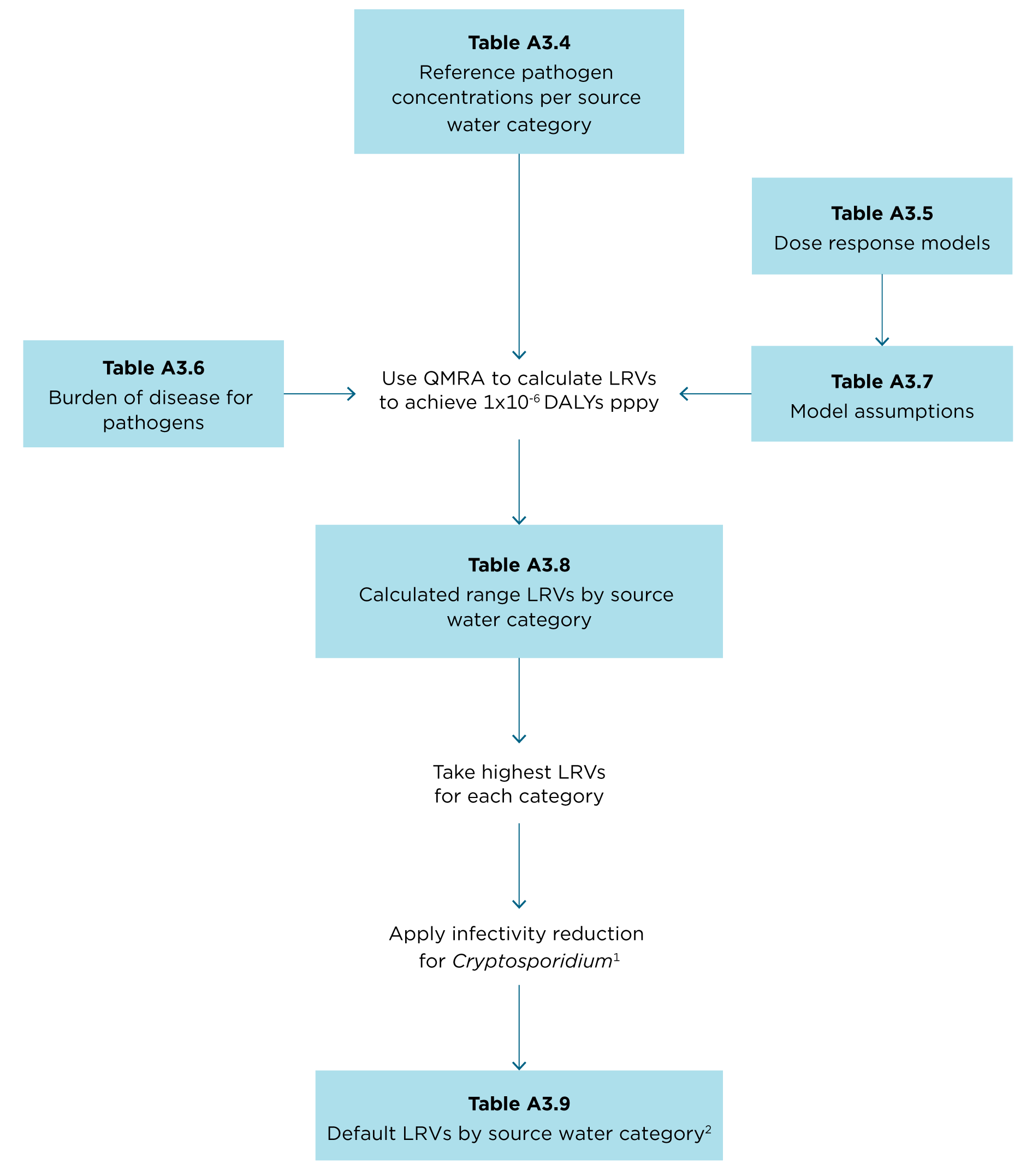 Figure A3.1 shows how the QMRA framework is applied to determine the LRVs in Table A3.9. Specific details of any step can be understood by following the explanations given in the corresponding sections of this appendix.