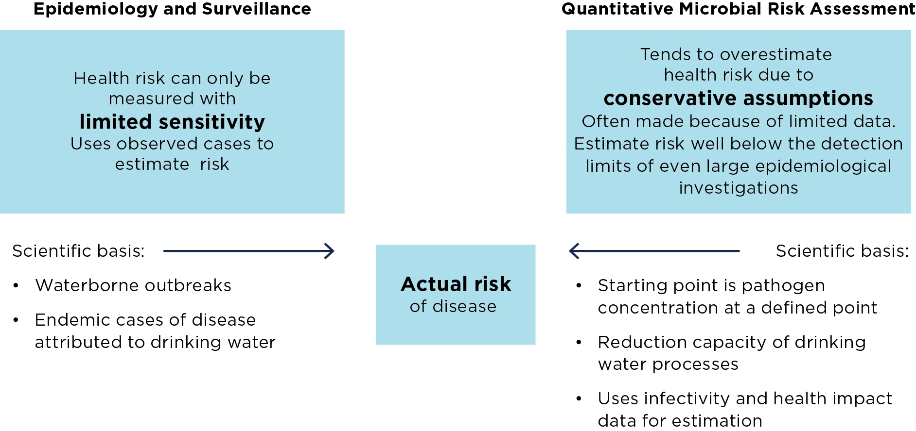 Given the limitations of disease surveillance mechanisms to measure endemic disease, an alternative approach is needed to estimate and manage endemic disease burdens to ensure that water is safe. QMRA investigates the likelihood of disease along a risk pathway from the point at which pathogen concentration is quantified (e.g. in a water source) to the receptor (e.g. a consumer of drinking water). Based on scientific evidence from environmental microbiology and controlled human feeding trial datasets, QMRA aims to estimate exposure and the resulting health impact (WHO 2016). QMRA is a logical framework that brings together a diverse range of important scientific evidence. However, the actual health impact is estimated (not observed) and is typically conservative.