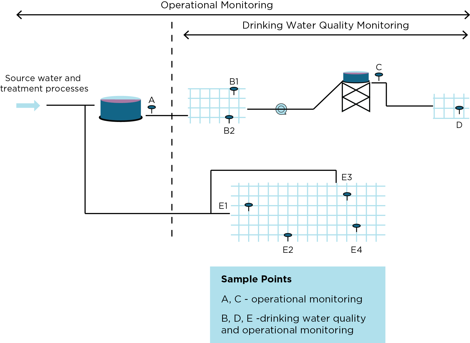Figure 9.3 provides an illustration of sampling locations within a typical distribution system and shows how operational monitoring and drinking water quality monitoring are integrated.