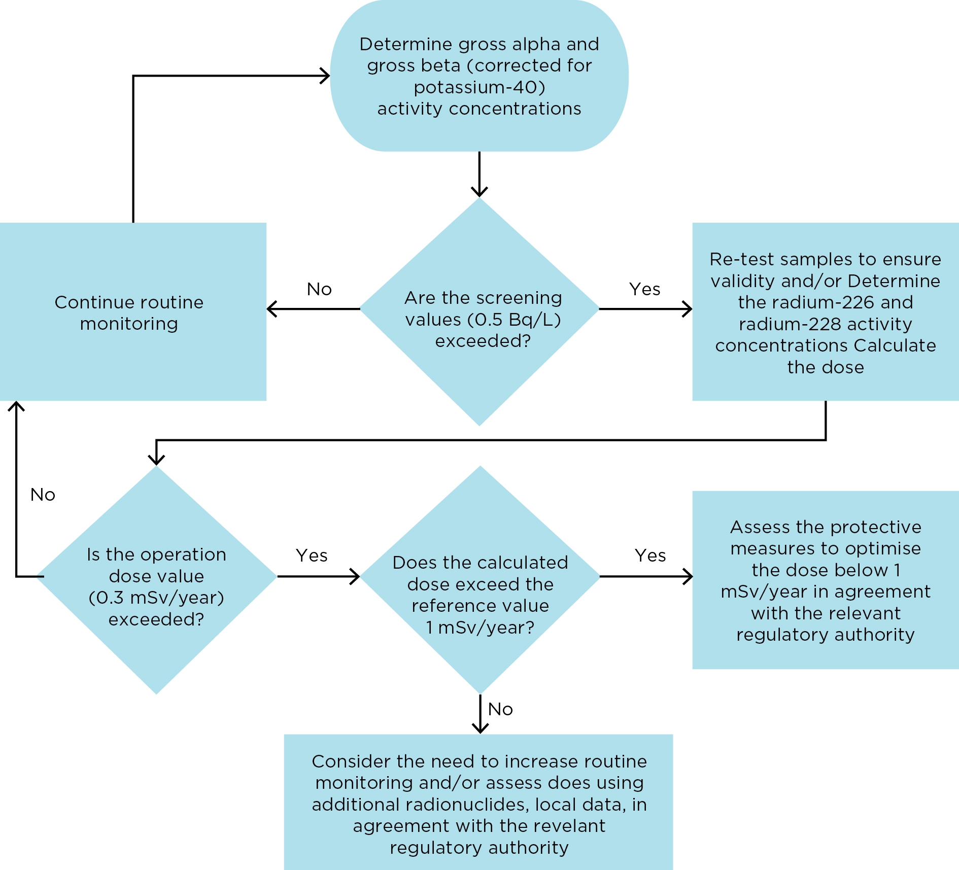 If the sum of the annual doses from all radionuclides is less than the operational dose value of 0.3 mSv, no additional action is required and routine monitoring can continue. If the sum of the annual doses from all radionuclides exceeds the operational dose value of 0.3 mSv, it is not appropriate to rely on a single analysis to determine annual exposure. In this case water should be sampled at a frequency which should be agreed to by the relevant health authority or drinking water regulator.