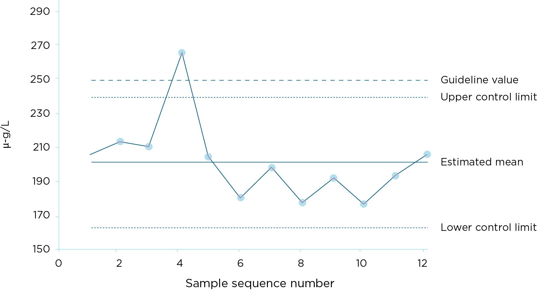 Figure IS3.4.1 shows an example of a control chart using trihalomethanes data, using 12 monthly measurements. In the example, the control limits have been placed at two standard deviations away from the mean. The guideline value would act as the critical limit. Excursions above either the control limit or the critical limit would prompt an investigation. The control chart shows that, except for the one excursion above the critical limit, trihalomethanes levels were generally under control during the period under review.